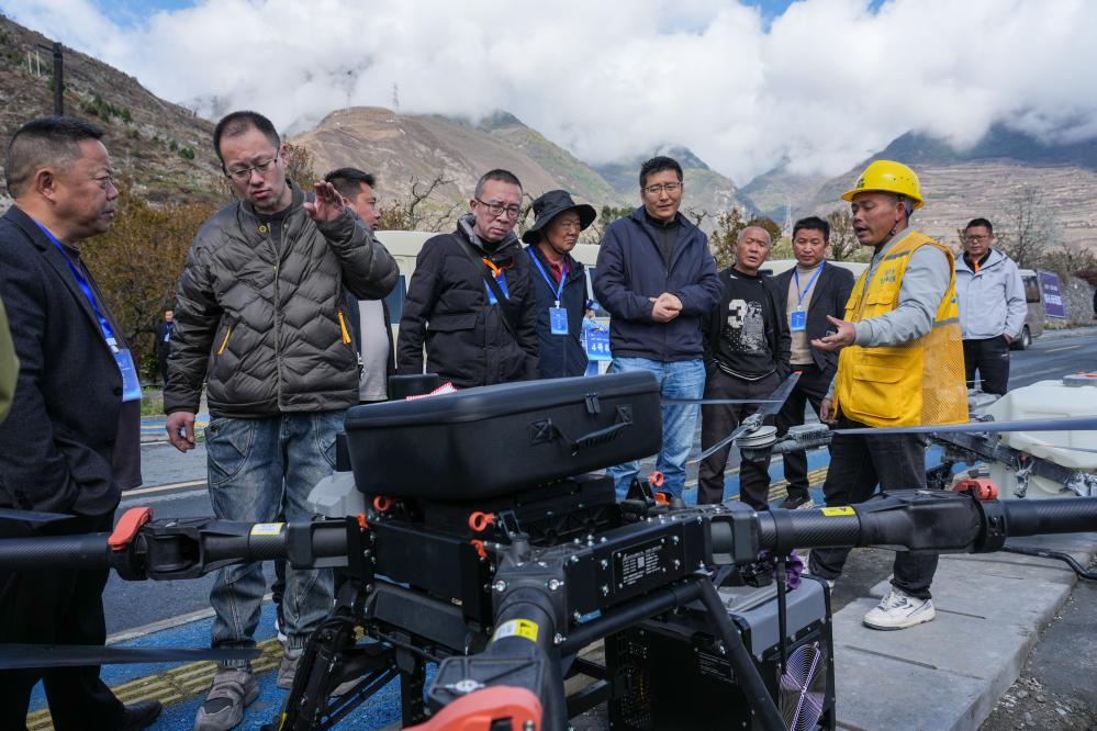 3月31日,在四川茂縣“茂縣李”標準化種植基地,2026“茂縣李”產業發展大會參會專家和客商了解無人機植保情況。新華社記者王曦 攝
