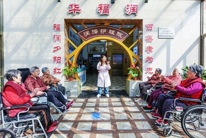 2026年3月25日,在山東省膠州市華福潤養護院,護理人員和老人一起做手指操。 新華社發(王昭脈 攝)