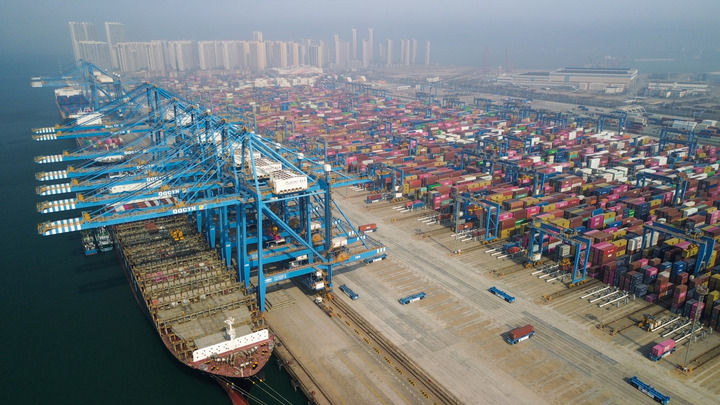 正在進行集裝箱裝卸作業的山東青島港全自動化集裝箱碼頭(2026年3月25日攝,無人機照片)。