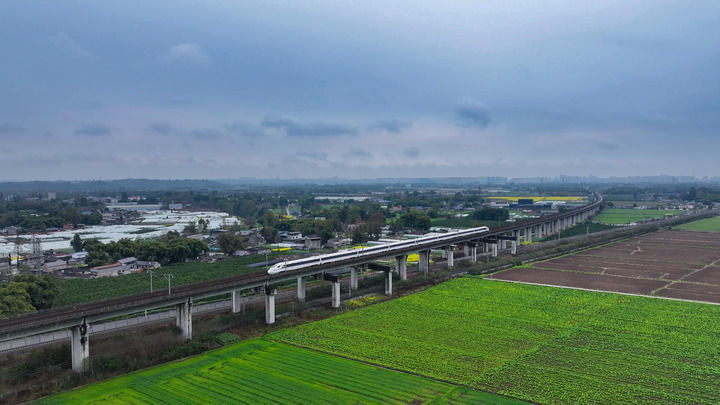 一輛列車運行在成都與眉山間(2026年3月3日攝)。