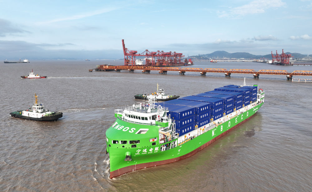 2026年4月15日,純電動智能集裝箱海船“寧遠電鯤”輪從浙江寧波舟山港北侖港區啟航,駛向嘉興港乍浦港區(無人機照片)。