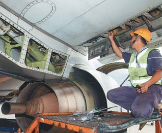 臺灣華航飛機事件后,華航昨天對同型的十二架飛機進行檢查。圖為工程師打開被懷疑是事故發生源頭,左上角、吊掛發動機的派龍架。(臺灣《聯合報》圖片)