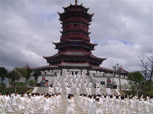 園博會開幕式后 閩臺島主體建筑杏林閣前 200位老年太極拳愛好者表演太極拳