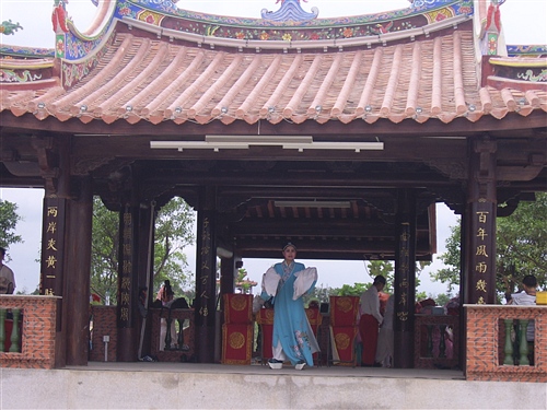 走進廈門園區,紅磚大瓦墻體、前后厝花園設計、燕尾飛檐屋頂,此外,再加上古厝前方戲臺上,以二胡為主要演奏樂器的歌仔戲表演,一股濃濃的閩南味撲面而來。廈門建設園區主要由3座古厝組成,其中一間名為“海峽兩岸”的古厝為中國國民黨榮譽主席連戰親筆題詞。走進古厝,環境清幽,內堂墻上掛有閩南古厝的介紹。閩南傳統建筑既有中國傳統建筑對稱、嚴整和封閉的性格,又具有華麗活潑、夸張矯飾的特征。彎曲的屋面、高翹的燕尾、花枝招展的剪粘、堆砌的水車堵,色彩斑斕的鏡面墻……處處表達出閩南建筑特有的風格。