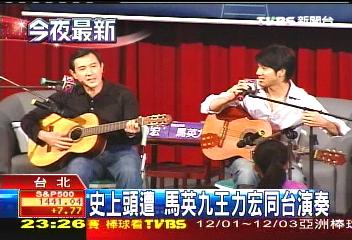 據報道,馬英九昨晚出席座談會時穿著牛仔褲和Polo衫,與王力宏合唱英文歌曲“I Understand”。馬英九說,這是他高三時花了170多元買的吉他練的第一首歌曲;王力宏則從未聽過此曲,先前還熱心找了一些“老歌”,沒想到在馬英九眼里全是“新歌”。