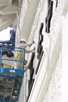 工程人員今天開始拆除“大中至正”四字。但因過于堅固,工人幾度換工具、用力搥打,一個上午只能切下螺絲頭。四字拆除后,就會換上新鑄的“自由廣場”。 (臺灣《聯合晚報》圖)