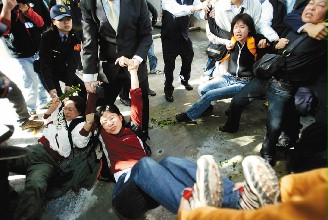 保護樂生團體也向陳水扁表達訴求,遭警方強制驅離。(臺灣《聯合晚報》圖片)