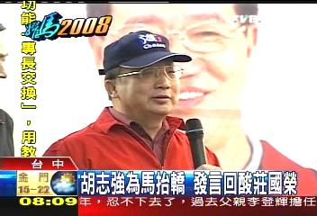 中國臺灣網12月16日消息 據臺媒報道,國民黨馬英九蕭萬長臺中市競選總部籌備處昨天揭牌,國民黨2008參選人馬英九親自主持揭牌儀式,擔任主委的臺中市長胡志強也前來相挺,并特別引用最近很紅的“莊國榮語錄”來抨擊執政黨,引發臺下熱烈回響。