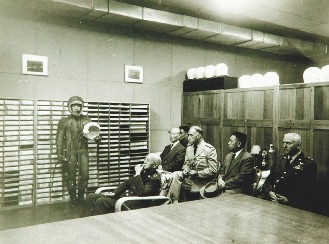 前排坐的是蔣介石,后排右一與三是美軍將領,右二及四是蔣經國與陳誠。他們在“黑貓中隊”成立前于桃園基地聽取簡報,了解加壓飛行裝備,這是U2使用的同款。(國民黨黨史館圖片)