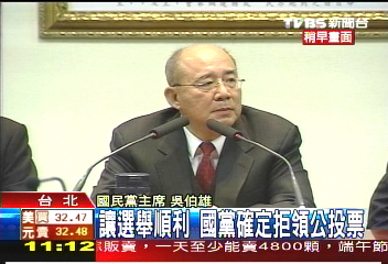 吳伯雄表示,為了選務順利進行委曲求全,不容民進黨用“公投”毀“大選”,既然“公投”已經被扭曲,成為引起沖突的工具,因此決定呼吁選民拒領“公投票”。 (云鵬)