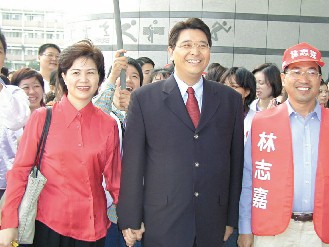 圖為陳錦滿陪林志嘉辦理“立委”候選人登記。(聯合報圖)