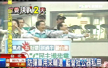 陳水扁的防彈公務(wù)車大咧咧地貼著民進(jìn)黨的競(jìng)選標(biāo)語(yǔ) (臺(tái)灣TVBS電視臺(tái)畫面截圖)