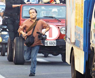 馬英九昨天上午陪國民黨“立委”候選人掃街拜票,香港記者李東杰搶拍完畫面,跑步追趕已向前行進的采訪車。(聯(lián)合報圖)