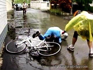 換胎后,杜正勝穿著輕便雨衣繼續向前行。在一個轉彎上坡路段,可能是雨天路滑,杜正勝的腳踏車龍頭不穩,開始搖搖晃晃,后方的同仁緊急上前試圖幫他穩住,但似乎扶不住不斷晃動的單車,杜正勝跌倒在地。