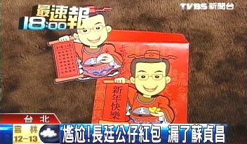 報道稱,對此,不少蘇貞昌的支持者強烈反映,蘇系子弟兵趕緊通過臺北縣競選總部,搶在年關前,印出一批剛出爐的長昌公仔紅包,比原版多了蘇貞昌,但為尊重謝長廷,上面的蘇貞昌公仔硬是比謝長廷公仔小了一截。而謝陣營發現紅包獨漏副手的問題后,春節造勢活動也趕緊補做長昌公仔門神。(高大林)