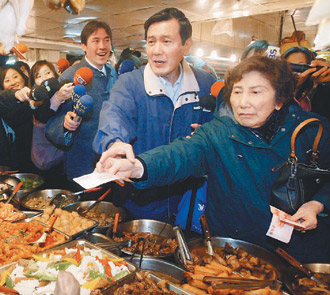 謝長廷昨天到臺中市天津街年貨大街向民眾拜年,并發送新臺幣10元紅包,一小時內發出3000個。(聯合報圖)
