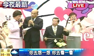 謝長廷競選辦公室晚間舉行情人節(jié)活動,謝長廷、蘇貞昌夫婦均出席,兩人除了高唱情歌,還自制巧克力,送給夫人和現(xiàn)場的媒體記者以及輔選干部。