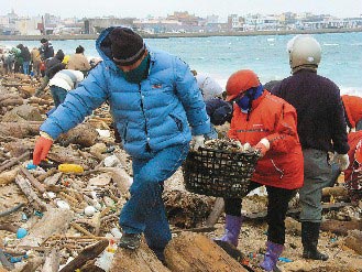 澎湖縣政府今天清晨發動大批公務員到澎湖海邊清理凍死魚尸,臺灣《聯合晚報》記者肇瑩如攝
