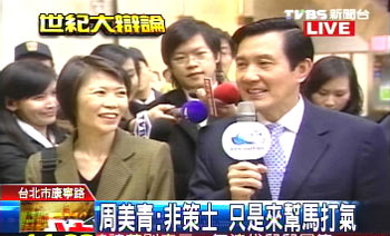 馬英九在夫人周美青及幕僚人員陪同下,于下午1時(shí)抵達(dá)辯論會(huì)場(chǎng)。馬英九表示自己心情平靜。對(duì)外界普遍看好謝長(zhǎng)廷口才,周美青則認(rèn)為,只要大家盡力就好。當(dāng)被問(wèn)及如何幫助馬英九時(shí),周美青只說(shuō)會(huì)建議馬英九放輕松,“我不是他的督軍,只是在旁邊倒茶水”。