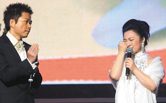 白冰冰(右)在國民黨舉行的228紀念音樂會中提到女兒被撕票案,講到激動處一度落淚
