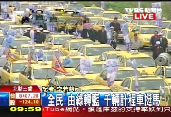 據臺灣“中央社”報道,臺灣“全民出租車”的凝聚力很強,過去歷次選舉都是堅決支持民進黨,但是這次臺灣地區領導人選舉支持對象“由綠轉藍”,受到外界關注。今天上午,在馬英九、蕭萬長后援會成立大會上,2500輛出租車排滿路面,臺“立法院長”王金平、臺北縣長周錫瑋及三重市長李干龍等人都到場致意。