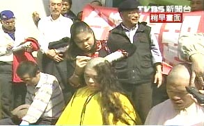 “拒領公投票聯盟”上午在臺灣“立法院”群賢樓前召開記者會,十幾位成員響應剃光頭活動,剃光頭的人士中包括“紅衫軍”自主公民協會理事長林正杰,而唯一一位女性鄭美英,因長發及腰備受注目。鄭美英表示,頭發已留了12年,頭發再留就有,只希望臺灣經濟能好起來,能換一個很有智慧的領導人將經濟帶領到很好的階段。