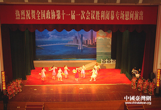 中國臺灣網3月16日北京消息 以反映海峽兩岸京劇梨園世家文化藝術交流、情感交織為主線的大型現代京劇《海上生明月》昨晚在全國政協禮堂演出。全國政協副主席孫家正、國臺辦副主任孫亞夫、海協會副會長張銘清等觀看了演出。