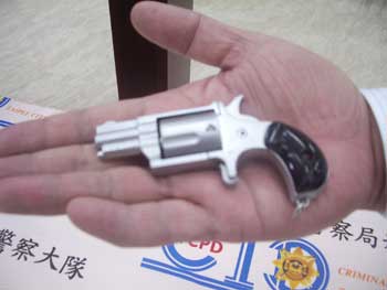 中國臺灣網3月20日消息 臺北市警方今天抓獲一名正在交易的女毒販時,除當場查獲毒品海洛因,還發現一把僅10公分長的迷你型改造“掌心雷”左輪手槍。