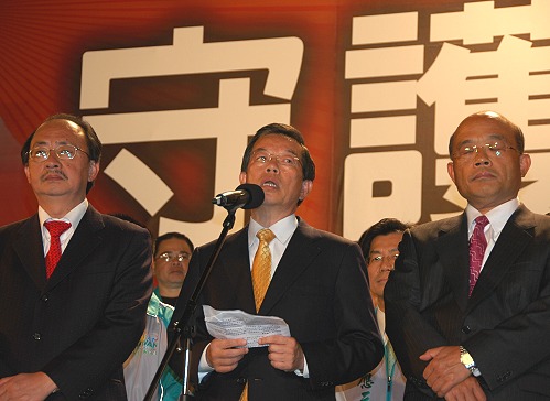 22日晚,在臺灣地區領導人選舉中敗選的民進黨候選人謝長廷(中)面對支持者深深鞠躬,他表示承認、并會承受選舉結果,也會為敗選負起責任,但是他不會離開臺灣。謝長廷目前擔任民進黨主席。此前,謝長廷表示,如果這次敗選,將永遠退出臺灣的政壇。(圖片來源:臺灣聯合新聞網)