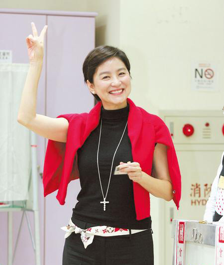 林青霞22日投票后打出“V”的手勢 (臺灣《中國時(shí)報(bào)》圖片)