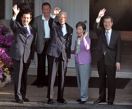 馬英九(左一)與蕭萬長(右一)前往翠山莊拜會李登輝(左二),李與夫人曾文惠(右二)親自到門口迎接,四人并向守候的媒體揮手。(臺灣“中時電子報”圖)