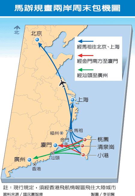 陳世圯指出,馬英九辦公室規(guī)劃北飛上海、北京班機,走馬祖航線飛越海峽中線進入上海飛航情報區(qū);往廣州的航班,經金門附近由汕頭進入廣州,往廈門航班則由金門附近偏南飛行,經惠安抵廈門,都不直接經過金門上空,舍棄以往繞行香港飛航區(qū)限制;至于進入大陸航線如何飛行,仍待兩岸協(xié)商。