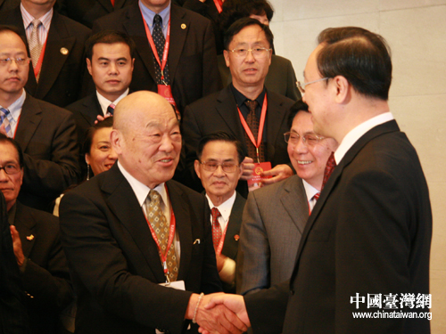 全國政協副主席、中共中央統戰部部長杜青林與參加中國和平統一促進會第七屆海外統促會會長會的海外統促會會長親切握手。