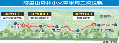 阿里山小火車上月30日第一次發(fā)生脫軌意外,調(diào)查發(fā)現(xiàn)疑似邊坡石塊滾落,導(dǎo)致第4節(jié)車廂傾斜;第二次是4月1日,后方的機(jī)關(guān)車車輪打滑,推擠第7節(jié)車廂,造成脫軌。嘉義林管處隨即將原來(lái)以兩輛機(jī)關(guān)車推拉8節(jié)車廂行駛的方式,改由一輛機(jī)關(guān)車推進(jìn)5節(jié)車廂。(高大林)