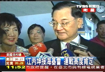據臺灣TVBS 報道,受邀到美國大學演講的國民黨榮譽主席連戰及其夫人連方瑀,在洛杉磯過境轉機。連戰聽到國民黨副主席江丙坤將要接掌海基會的消息,給予高度的肯定:“好極了!非常好!”