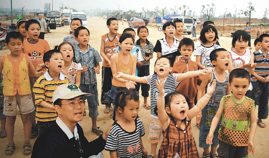 臺灣慈濟志工昨天在四川金山鎮帶著失去親人的孩童唱歌,希望藉由歌聲,讓孩子們忘卻地震帶來失去親人的創痛。(圖片來源:臺灣《聯合報》)