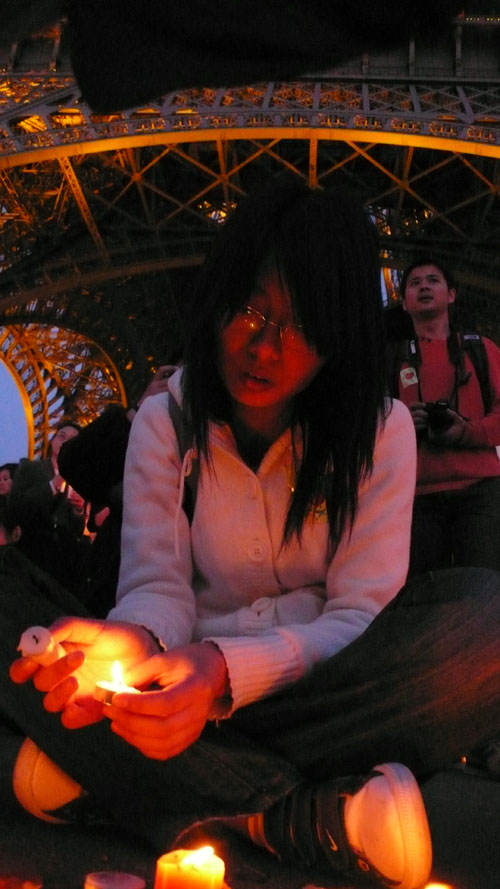 巴黎當地時間5月18號晚,近千名在法華人、華僑、留學生和法國友人聚集在埃菲爾鐵塔下,為“5?12”四川大地震遇難者舉行燭光祈福會,以表達對地震災區逝者的哀思和對生者的祝福。