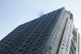 遭遙控飛機撞上的天闊28樓冒出陣陣濃煙。臺灣《聯合晚報》記者張佑齊攝