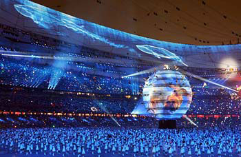 北京奧運開幕典禮表演節目展現“同一個世界,同一個夢想”的主題。臺灣《中國時報》圖
