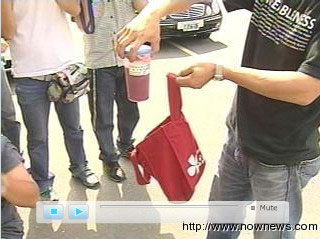 臺灣民眾送鮮紅飲料,諷陳水扁別吸人民血汗錢。來源:臺灣今日新聞