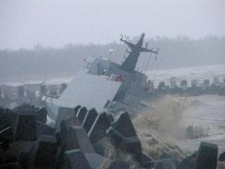 據報道,歷經薔薇臺風后,擱淺的導彈快艇已被潮水沖上消波塊,船身也因撞擊消波塊而造成許多破洞。由于昨天海上的風浪仍大,臺海軍將等風浪變小后再進行拖吊作業,如果拖吊不順利,不排除全部拆解后,運回左營軍港重新組裝。