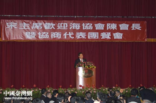親民黨主席宋楚瑜5日設午宴歡迎海協會會長陳云林及海協會協商代表團一行。這是陳云林在宴會開始前上臺致辭。中國臺灣網 田云鵬攝