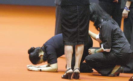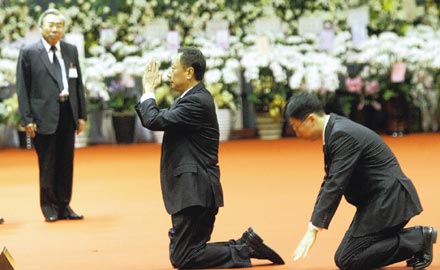 王永慶夫人李寶珠在靈堂前行跪拜大禮,思念丈夫的情緒與淚水一起宣泄。圖:臺(tái)灣《聯(lián)合報(bào)》