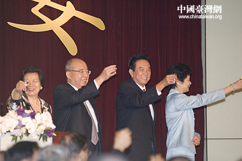 中國國民黨主席吳伯雄5日晚在臺北晶華飯店設宴歡迎海協會協商代表團陳云林一行。宴會現場云集了島內多位政商名流。吳伯雄與陳云林分別致辭,賓主共同舉杯,為兩岸關系和平發展許下美好祝愿。(田云鵬 攝)