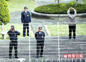 陳水扁昨天放風(fēng)時,故意背對媒體做體操,看守所管理員也對媒體進(jìn)行監(jiān)看。來源:臺灣《蘋果日報》