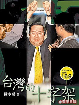 陳水扁看守所中所寫“臺灣的十字架”一書19日發(fā)行,封面是陳水扁第一次被羈押時戴手銬高舉雙手的畫面。來源:臺灣《蘋果日報》