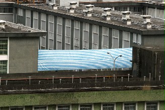 臺北看守所昨日下午在陳水扁放風(fēng)運(yùn)動的場地圍墻架起大型帆布,遮擋媒體鏡頭。(圖片來源:臺灣“聯(lián)合報(bào)” )