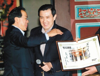 馬英九(右)與大提琴家馬友友(左)昨在板橋林家花園對談,兩人相談甚歡,并在“雙馬高峰會”紀念簿上簽名。(臺灣《聯(lián)合報》圖片)