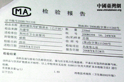 報道中提到:這瓶水由武漢頂津食品公司襄樊分公司生產,經送檢荊州市疾病預防控制中心檢測得知,有效氯含量達1.89g/L。而向建華則認為,自己正是由氯的刺激導致嘔吐伴有吐血。
