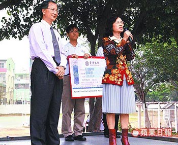 中國臺灣網(wǎng)2月27日消息 據(jù)臺灣《蘋果日報》報道,臺灣一名初中退休老師,昨捐出100萬元(新臺幣,下同)給臺南市私立瀛海中學(xué),做為清寒學(xué)生獎學(xué)金。她上臺致辭時一度脫稿演出,點(diǎn)名陳水扁,想呼吁陳水扁將海外賬戶金錢匯回臺灣做善事,校長擔(dān)心太過政治化,請師生以掌聲中斷她的致辭。